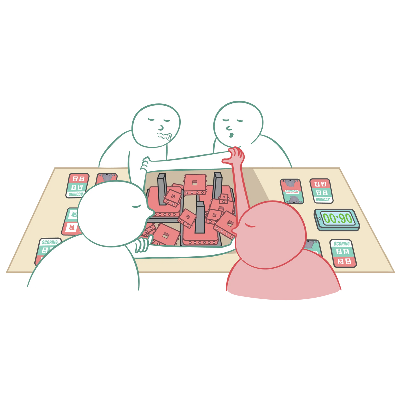 Instead of using the box lid as a Boundary, all players link their arms together hand-to-elbow to form the Boundary. Throughout the entire Building phase, keep your eyes closed and keep your arms flat on the table, using your other arm to build. When a player is voted off, they stay a part of the link. You can switch which arm you use each round if you start to get sweaty.