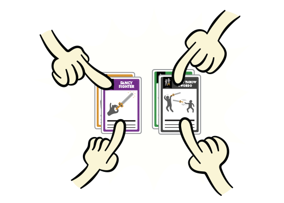 The goal of the game is to collect 3 sets of matching cards. Grab a bunch of cards and make Piles in the middle of the table. Everyone looks at the Piles and decides which one will help them complete the sets of matching cards they’re working on. On the count of three, each player points to the card Pile they want. If more than one player picks a Pile, it’s time to duel! Grab your Swords and fight using the rules laid out on the cards in the Pile (ex: “Keep your knees together for the whole fight” or “Toss your Sword in the air and catch it before you’re allowed to fight”). Whoever makes contact first wins.