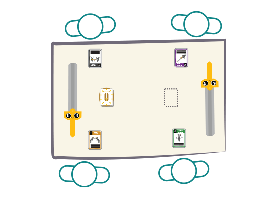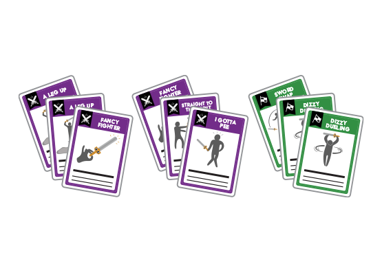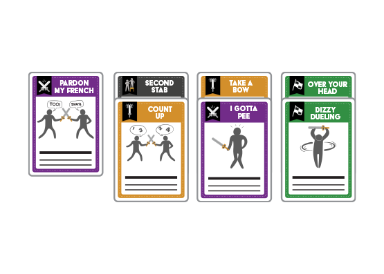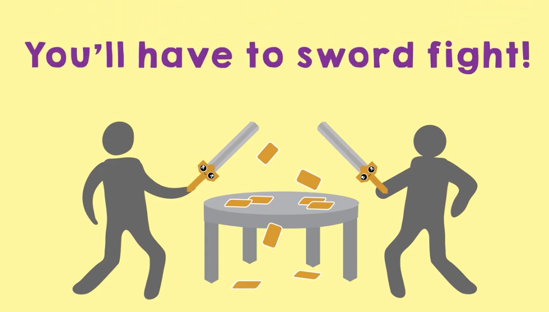 The goal of the game is to collect 3 sets of matching cards. Grab a bunch of cards and make Piles in the middle of the table. Everyone looks at the Piles and decides which one will help them complete the sets of matching cards they’re working on. On the count of three, each player points to the card Pile they want. If more than one player picks a Pile, it’s time to duel! Grab your Swords and fight using the rules laid out on the cards in the Pile (ex: “Keep your knees together for the whole fight” or “Toss your Sword in the air and catch it before you’re allowed to fight”). Whoever makes contact first wins.
